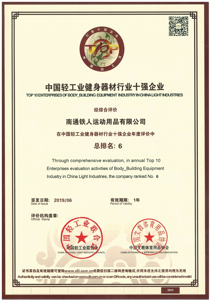 | 2019 | 2019中國輕工業(yè)健身器材行業(yè)十強企業(yè) | 中國輕工業(yè)聯(lián)合會、中國文教體育用品協(xié)會 |